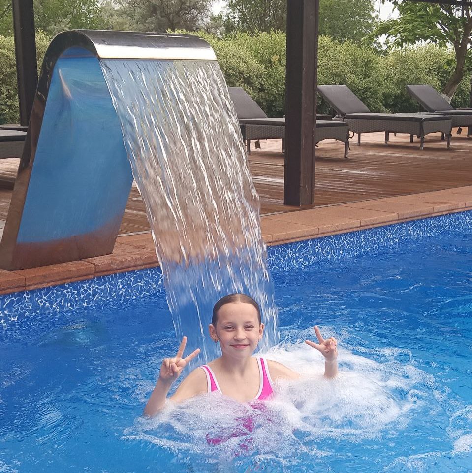 Бассейн размером 12х7 метров оснащен мощным противотоком, гидромассажем и водопадом.