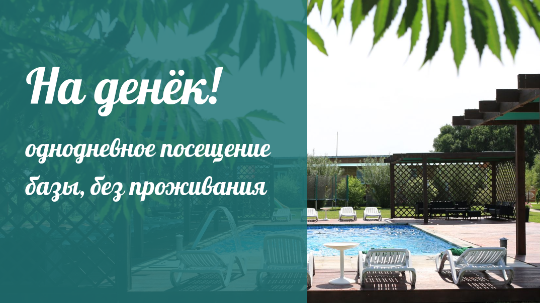 А вы знали, что можно отдохнуть «На Калиновке», не бронируя номер на сутки? Мы предоставляем прекрасную возможность провести целый день на территории базы или отправиться на рыбалку, чтобы потом приготовить трофеи в уютной беседке, попариться в бане, искупаться в открытом бассейне с подогревом или просто весело провести время с друзьями на базе отдыха!